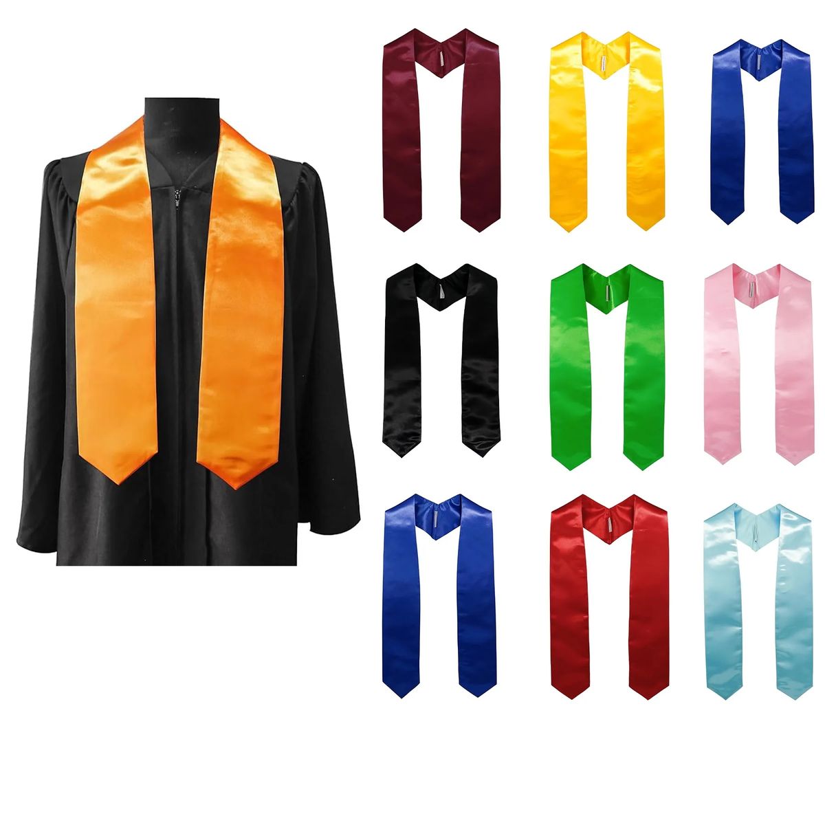 Crafted from high-quality polyester shiny satin, this graduation stole offers a smooth, luxurious finish, perfect for graduation ceremonies and special events. Measuring 60" long in total (30" per side) with a bottom width of 4.8" and a top width of 3.5", this graduation sash fits comfortably and elegantly for all body types. Made with precision machine weaving, this graduation stole ensures durability, uniformity, and a professional look for your graduation day.