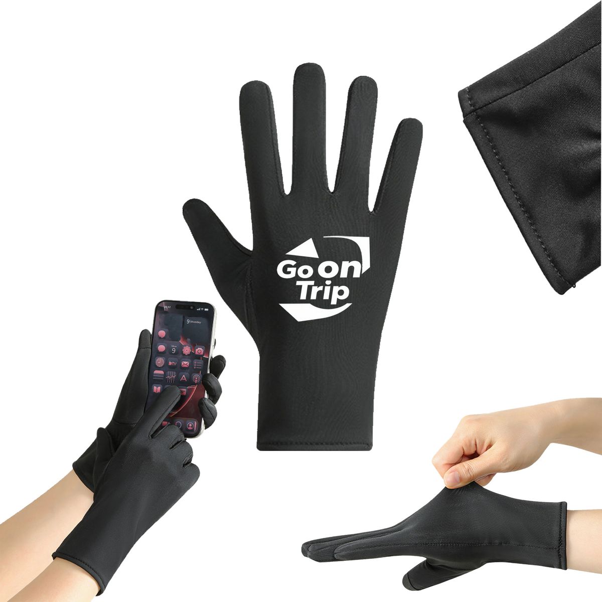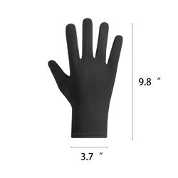This is a pair of black ice silk sun protection gloves made of nylon. It features a touchscreen design on the second finger of the right hand, making it convenient to use a mobile phone while cycling or outdoors. Your artwork can be added within this range. Suitable for cycling, hiking, driving and other outdoor activities, it provides effective sun protection while ensuring practicality. If interested, feel free to inquire. It comes with a 100% quality guarantee. Imprinted Size: with a palm width of 3" and a length of 4".